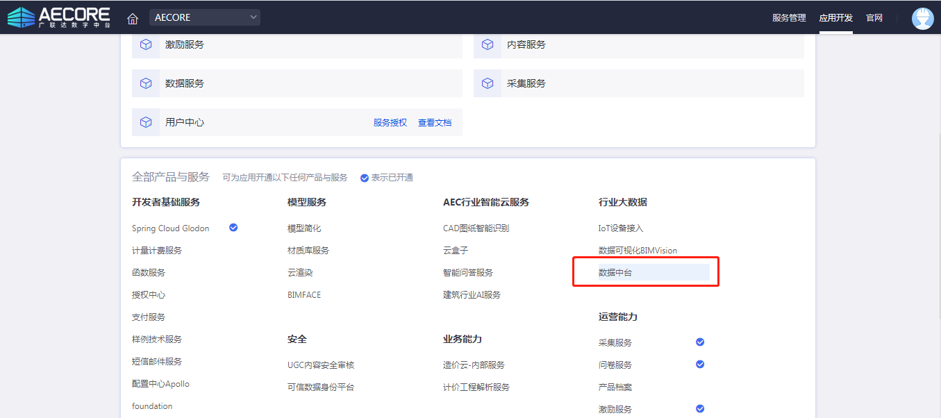 step1:登录AECORE,创建应用,开通304永利集团数据中台服务;