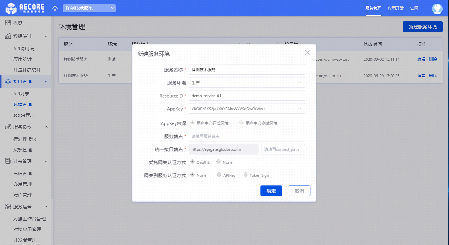 在弹窗页面,选择服务环境,填写服务端点和统一接口端点,并分别选择委托网关认证方式和网关到服务认证方式;最后点击确定创建环境。