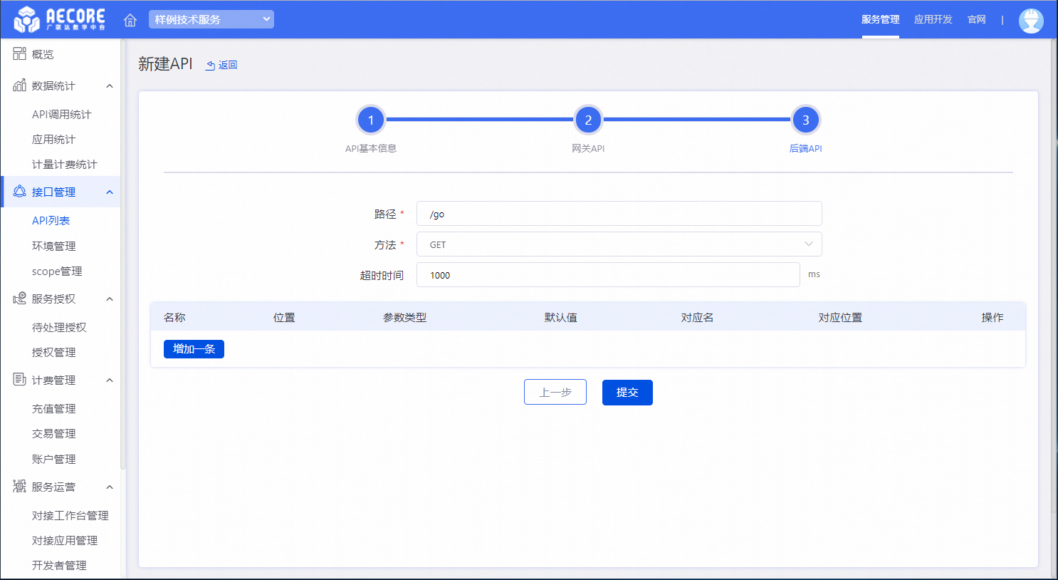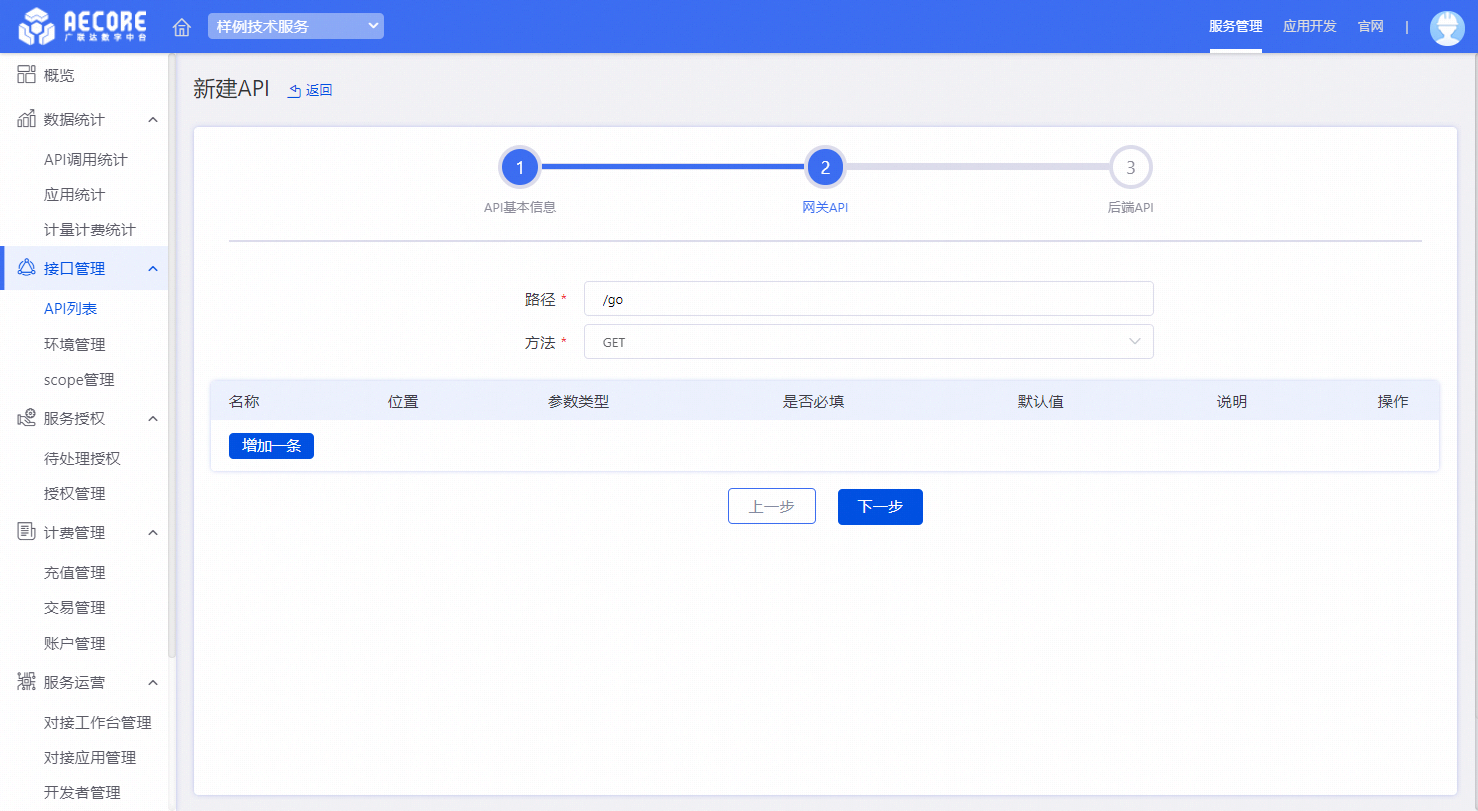 在API列表页面点击新建API后依次填写API基本信息、网关API、后端API。