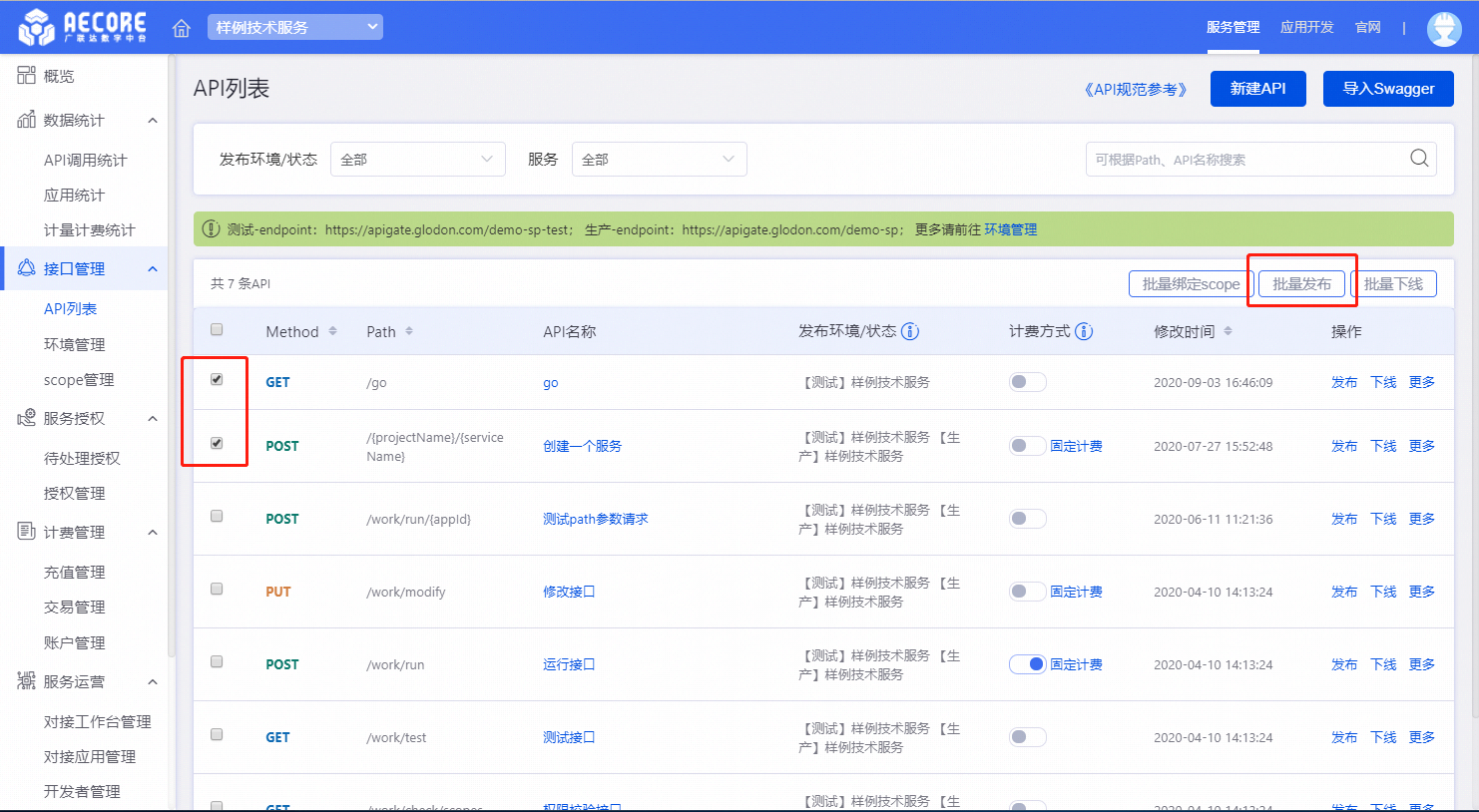 也可以批量发布多个API。在左侧勾选多个API之后点击批量发布。