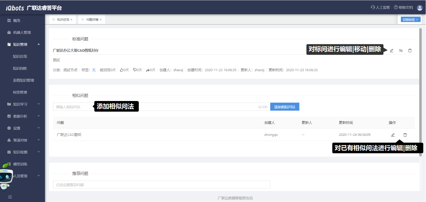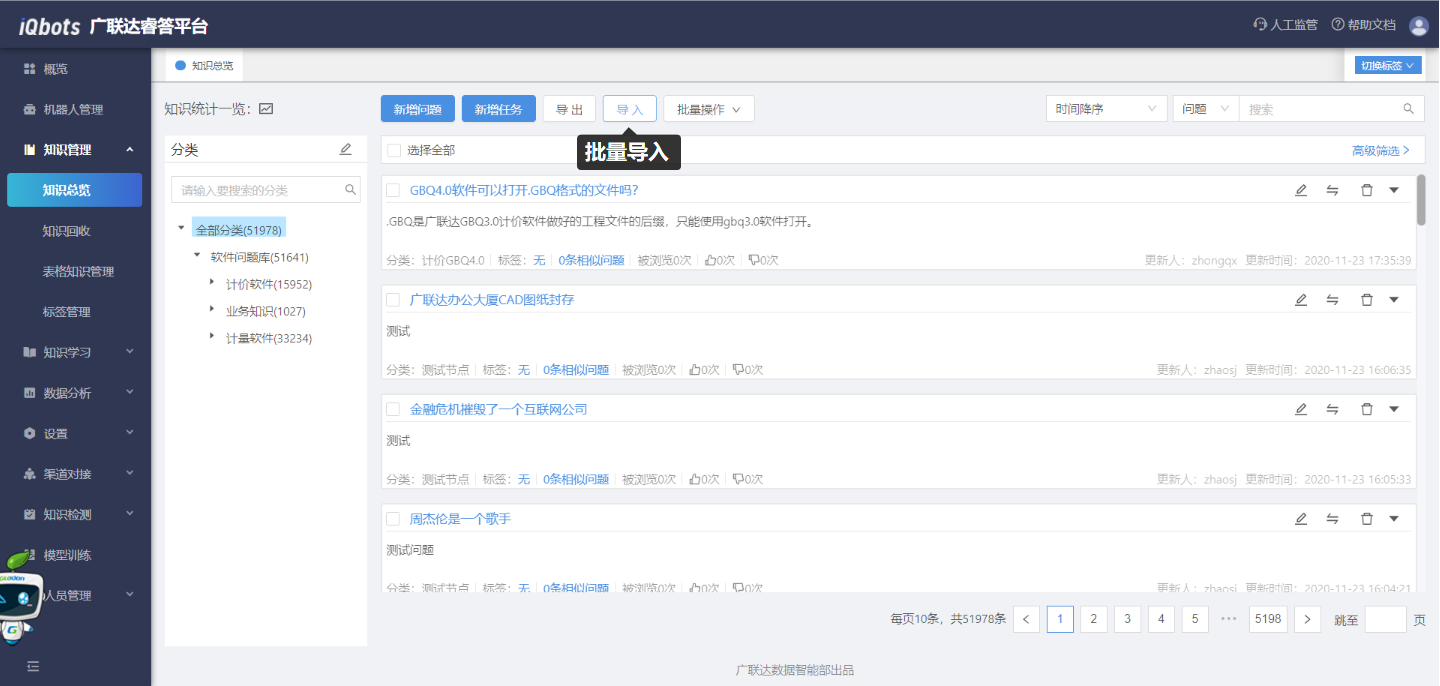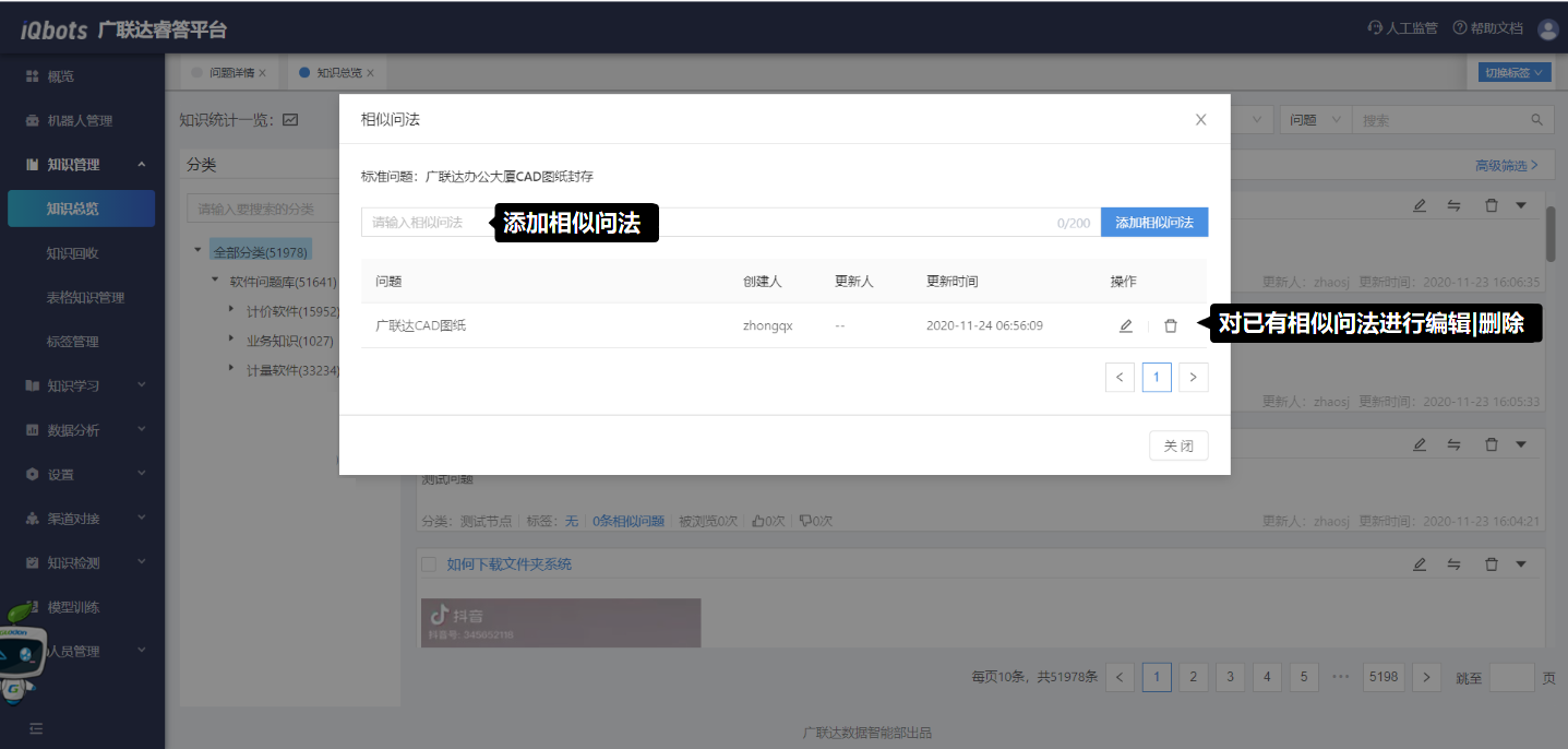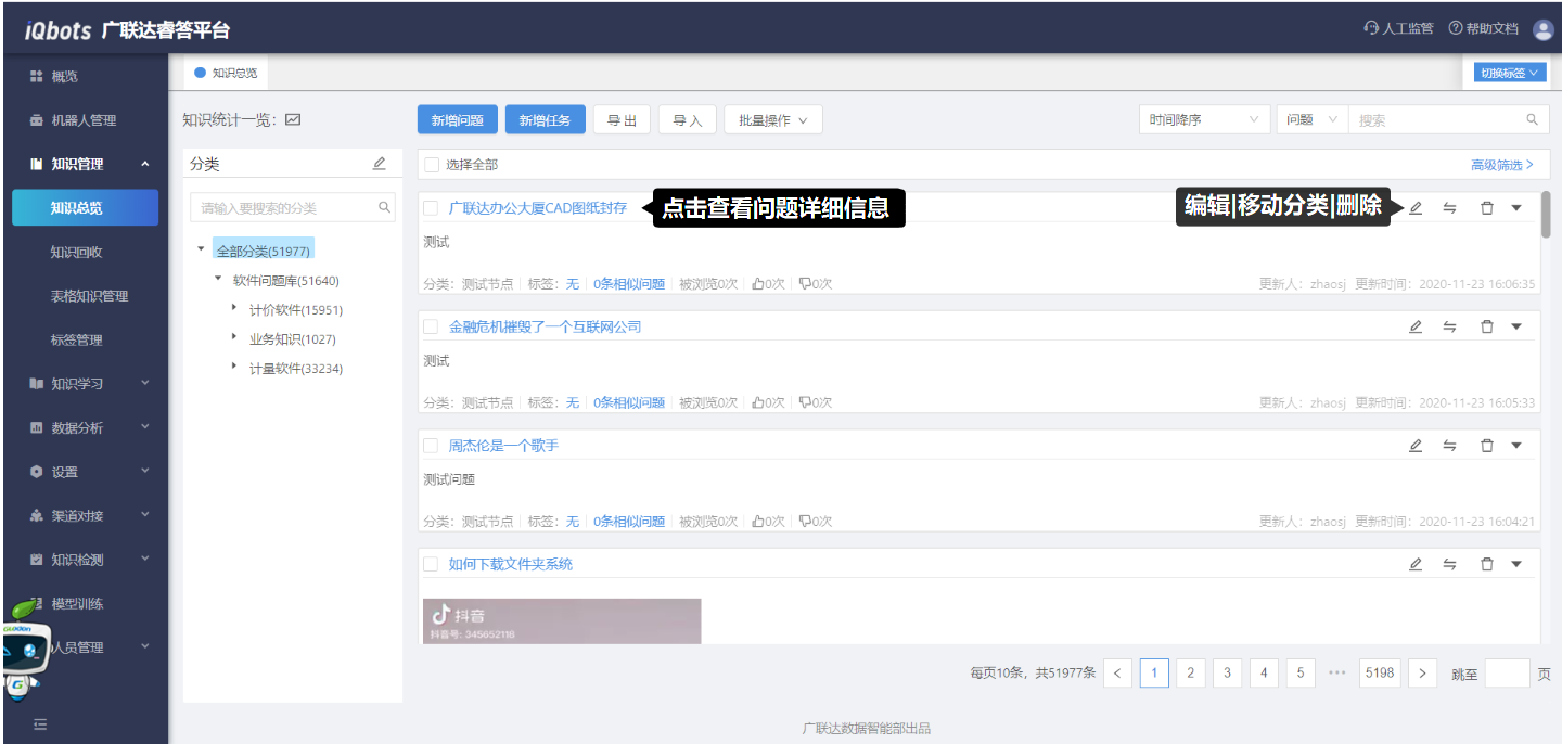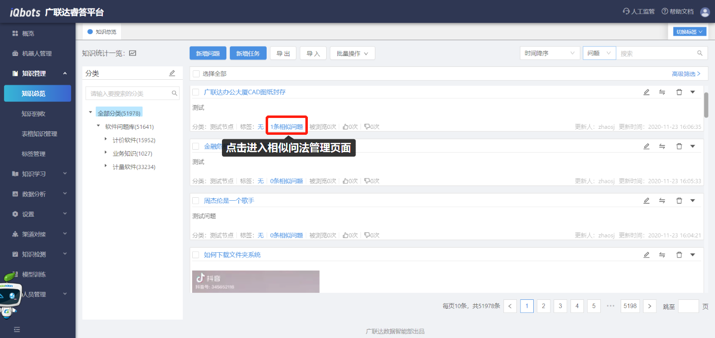 在知识总览页面,可以完成知识分类管理、问题的增删改查、问题的相似问法管理等。