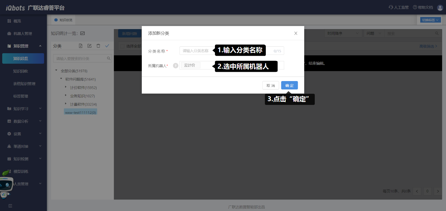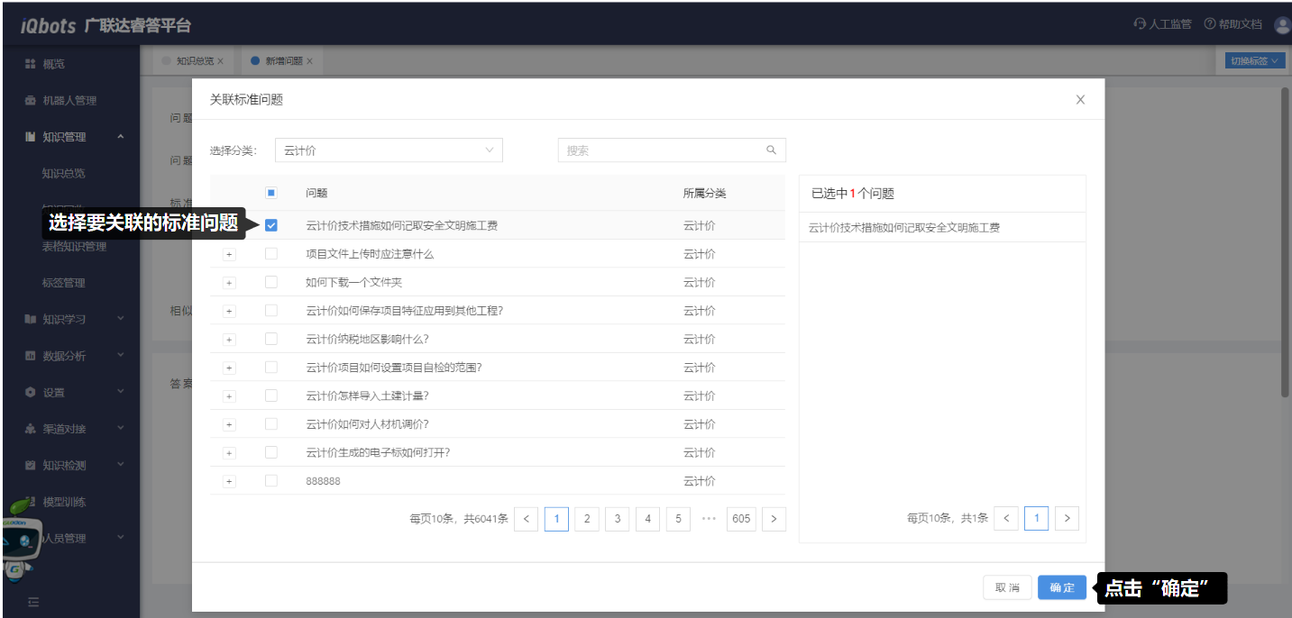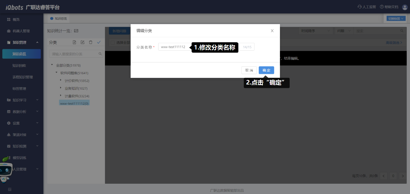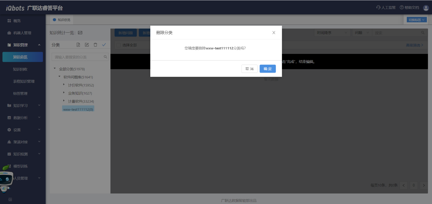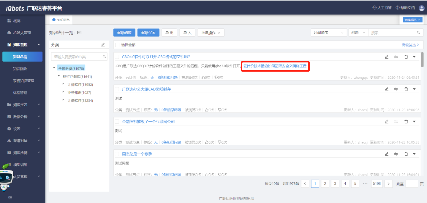 在知识总览页面,可以完成知识分类管理、问题的增删改查、问题的相似问法管理等。