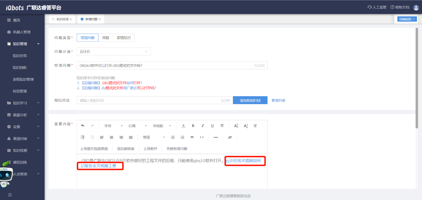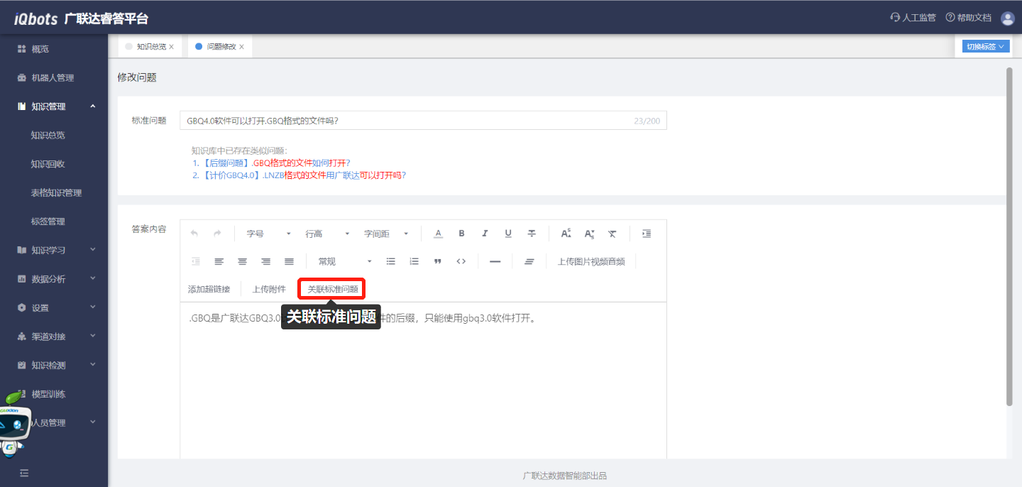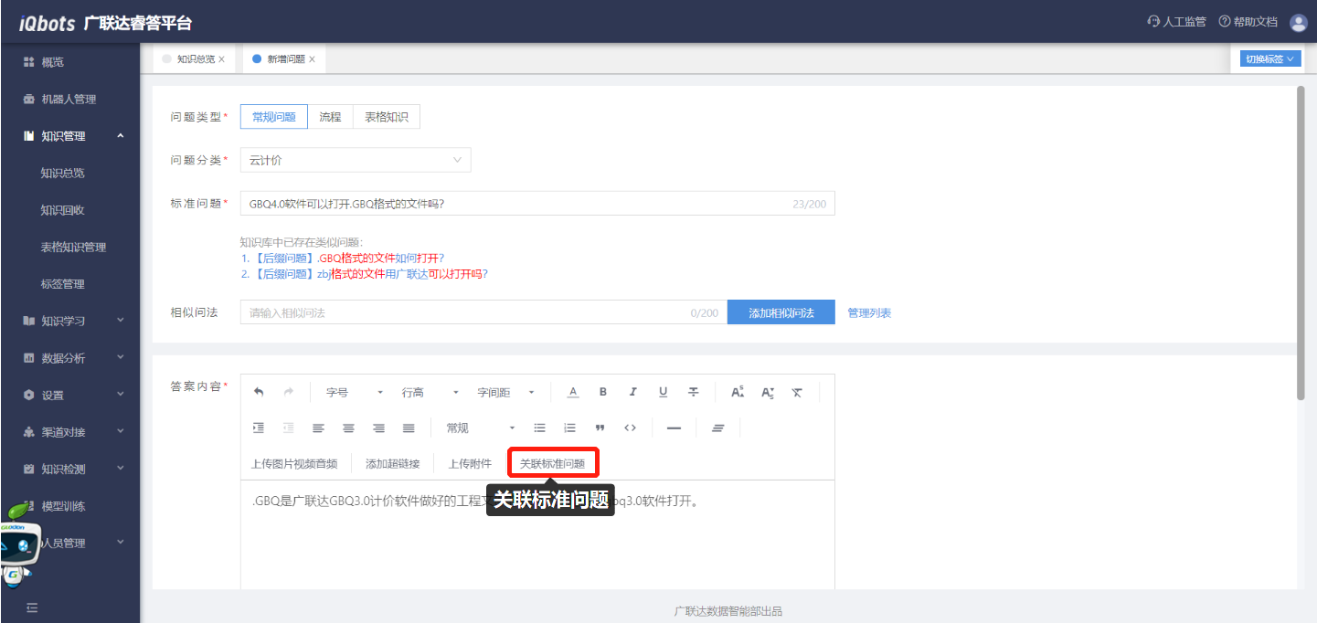 (4)输入问题答案,答案内容可进行富文本编辑,包括图片、视频、音频、超链接、附件等,同时还可以关联知识库内已存在的标准问题。