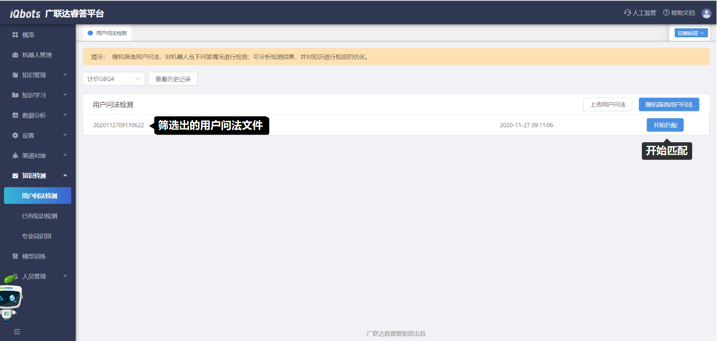 操作步骤:(1)选择机器人;(2)点击“随机筛选用户问法”;(3)在弹窗页面中设置筛选条件(时间范围、用户问法类型和用户问法个数),筛选用户问法;(4)点击筛选出的用户问法文件后的“开始匹配”,即可开始对用户问法进行检测。