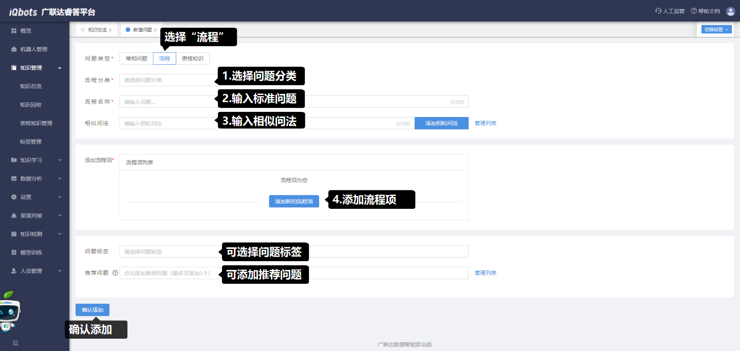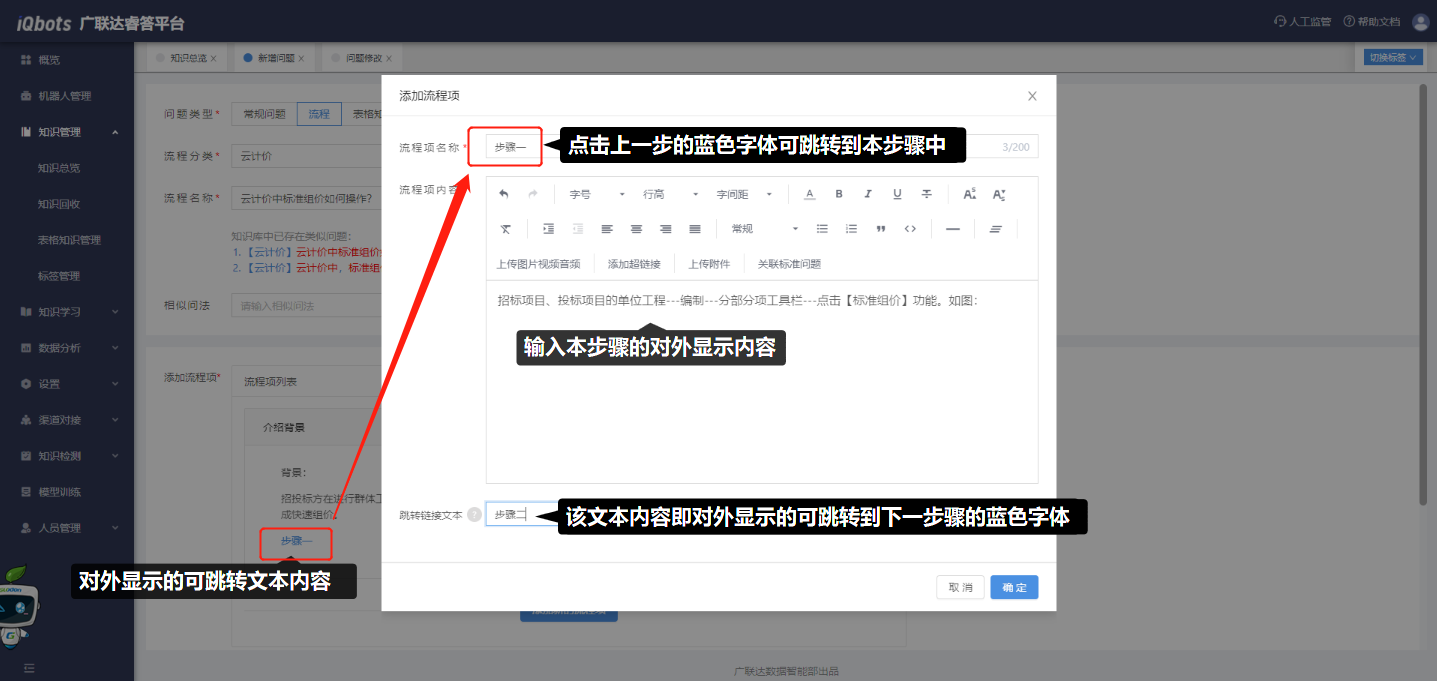 (4)点击“添加新的流程项”,在弹窗中填写对外显示的可跳转的文本内容(即流程项名称)、本步骤对外显示的答案内容(即流程项内容),答案内容也可进行富文本编辑,包括图片、视频、音频、超链接、附件等,也可关联知识库内已存在的标准问题。