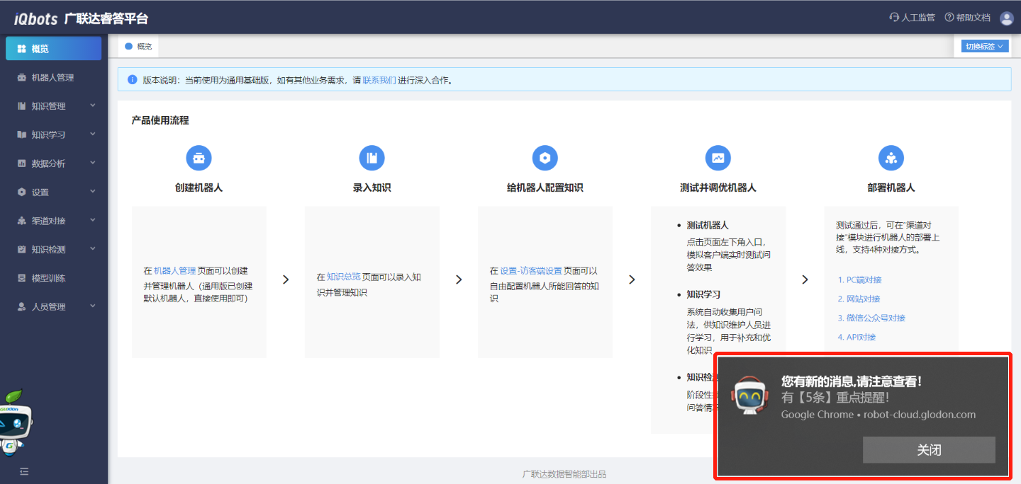 (3)当管理员打开人工监管页面,但并未停留在该页面时,若用户触发了“警示规则”/接管中用户有了新消息,则浏览器会在右下角会主动推送“重点消息”提醒通知。点击提醒通知,直接跳转到监管页面。(注意:要提前把浏览器消息通知功能打开,才能够收到消息提醒通知)