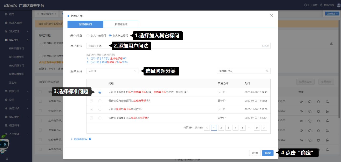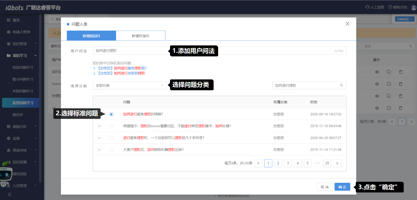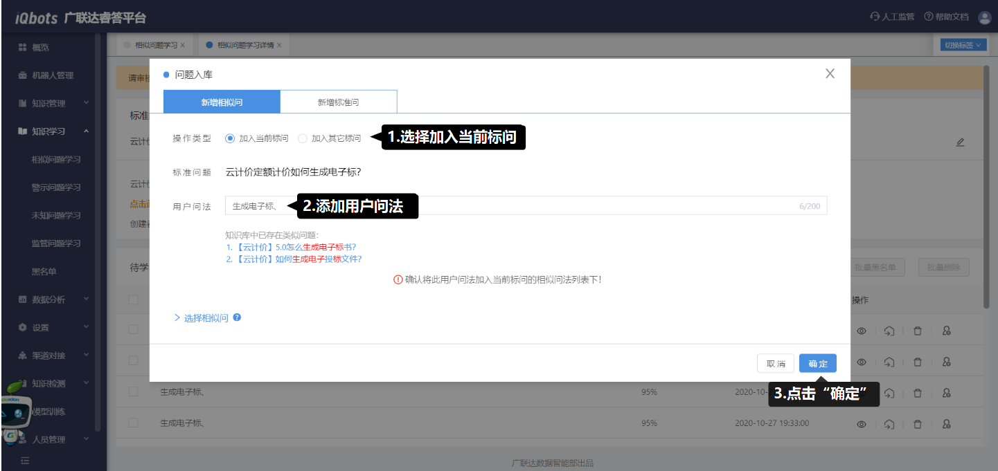 用于对用户的问法进行学习,将有效的用户问法加入到知识库,不断优化现有知识。主要有相似问题学习、警示问题学习、未知问题学习和监管问题学习。