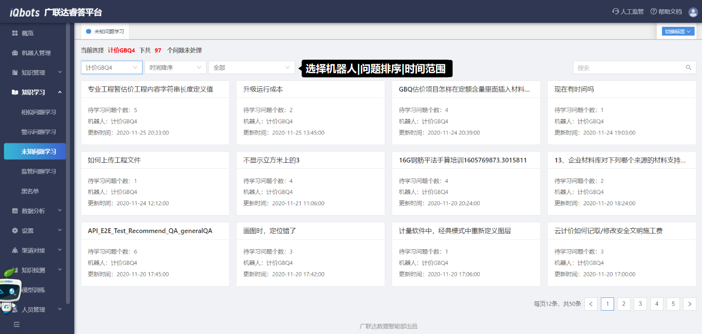 未知问题学习模块是机器人无法判断并回答出来的问题,或用户对机器人再次引导的问题无点击行为的问题汇总。用于收集机器人回答不上的用户问法,为知识库丰富新知识。