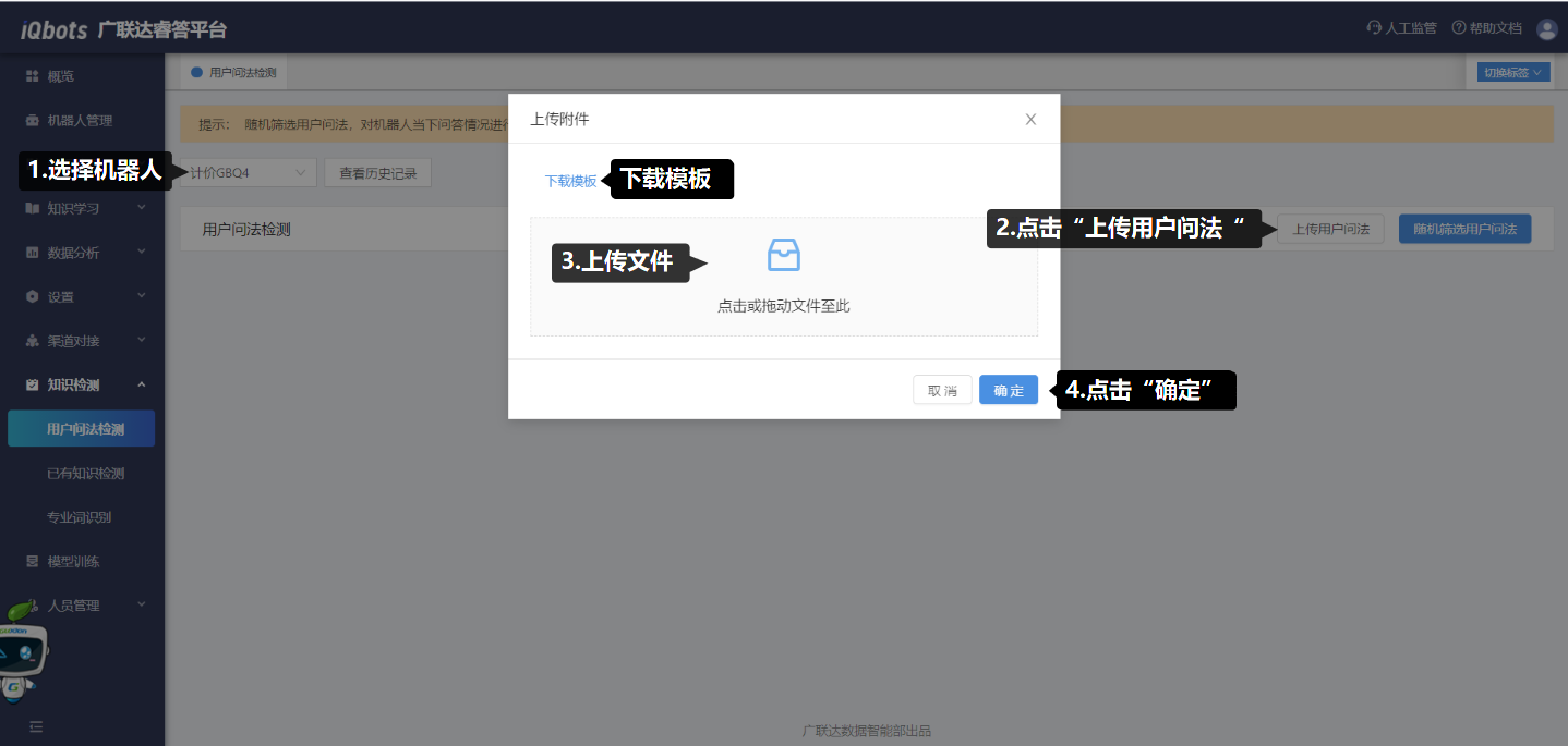 操作步骤:(1)选择机器人;(2)点击“上传用户问法”;(3)点击弹窗页面中的“下载模板”,按照模板要求上传问法文件;(4)点击上传的用户问法文件后的“开始匹配”,即可开始对用户问法进行检测。