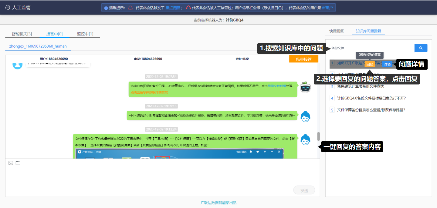 在人工接管的会话中,可直接点击右侧设置好的快捷回复短语进行回复;也可以选择搜索后的知识库回答文案进行一键回复。