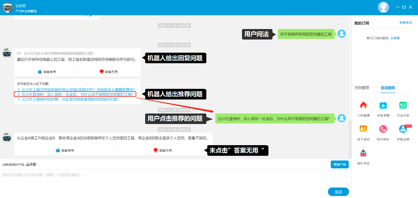 选中机器人后,在该机器人下面可以看到与用户交互的聊天记录。