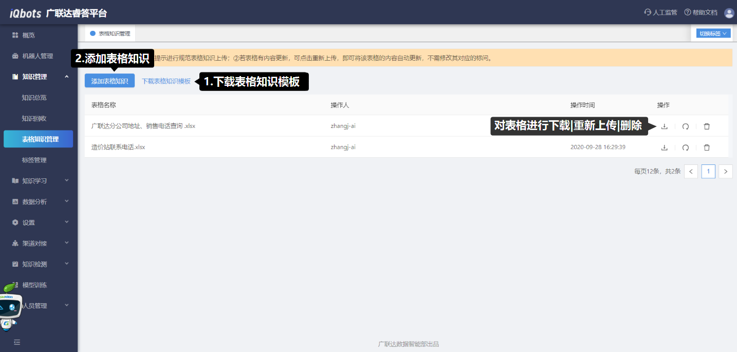 上传操作步骤:(1)点击“下载表格知识模板”,按照模板添加知识;(2)点击“添加表格知识”,点击或拖动拖动文件上传即可。