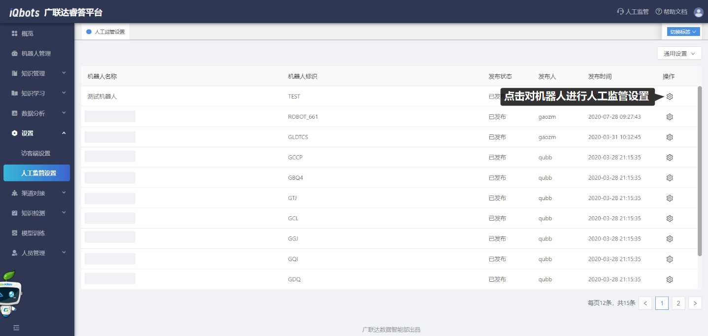 在机器人管理模块中,可以新建机器人、发布机器人、编辑已存在机器人的名称,以及删除建好的机器人。