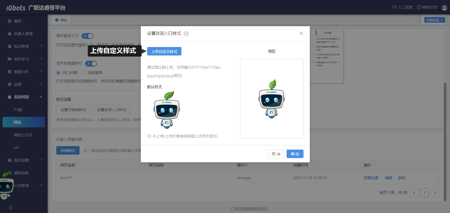 支持访客端样式和咨询入口样式设置,可上传自定义logo、自定义机器人头像、自定义用户头像和自定义样式。