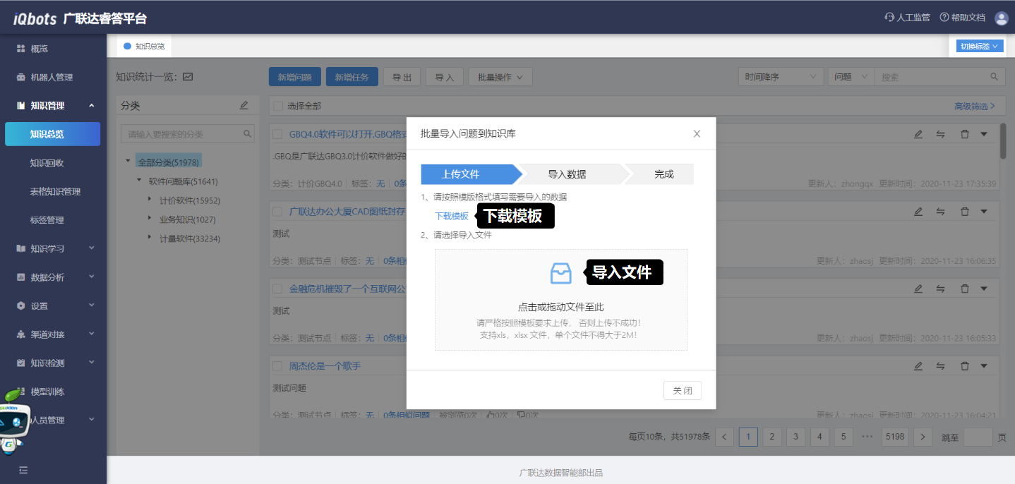 (1)点击知识总览页面上的”导入“按钮,在弹窗页面中点击”下载模板“;