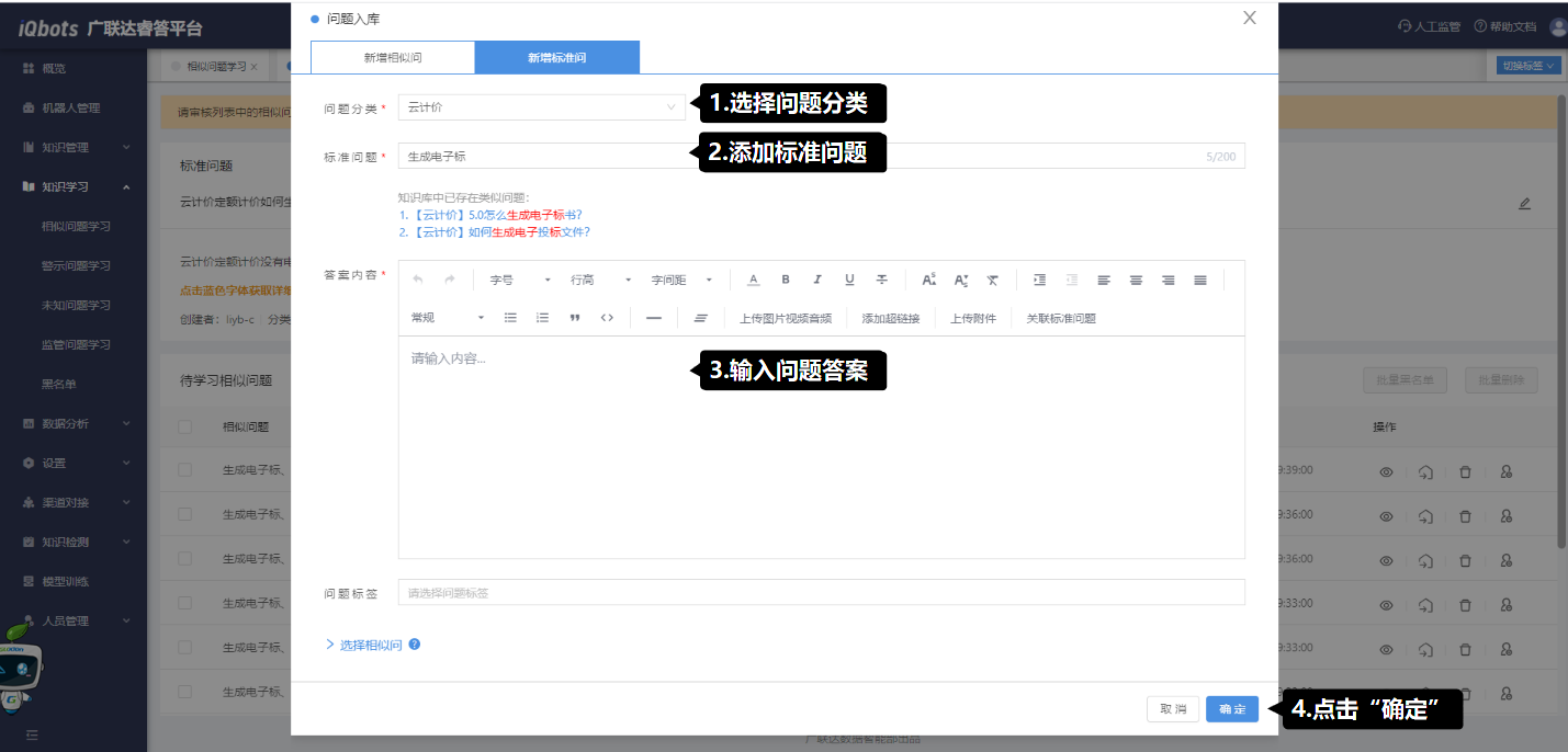 (2)若判断需要将该问题添加为新问题或其他标准问题的相似问,则需点击“问题入库”图标,在弹窗页面中进行编辑操作。