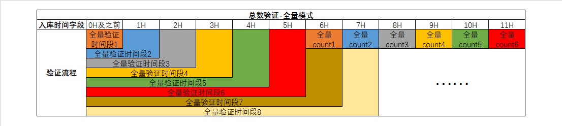 全量模式示意图见Fig 10,其中0H代表验证开始(整时),相同颜色代表一组需要全量验证的时间段和验证执行的时间,每一小时更新一次需要全量验证的时间段,在六小时后对数据目标中需要时间段对应的数据进行count计数,并与数据来源进行验证。