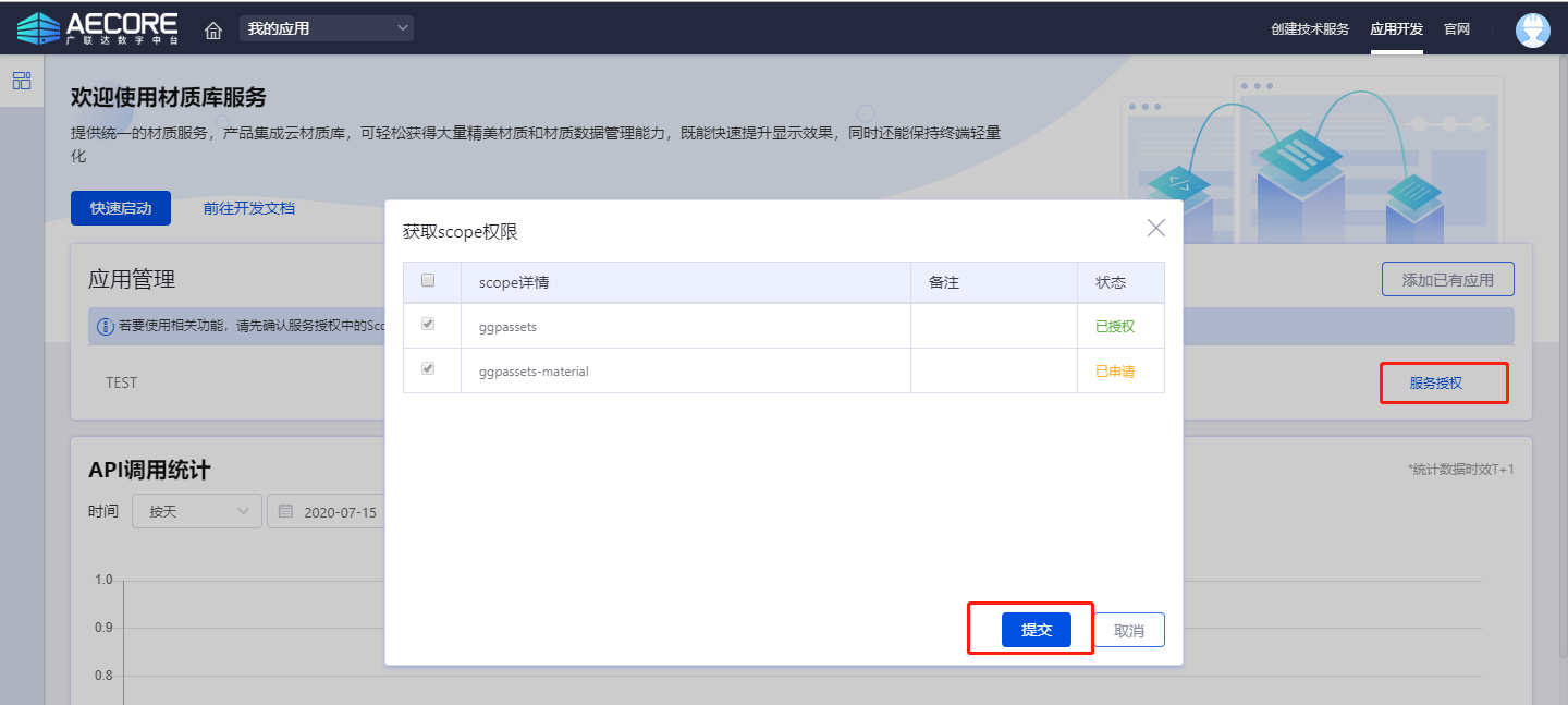 首先需要通过AECORE创建应用,获得应用程序的APPKey和Secret;然后申请开通材质库服务权限,待人工审核通过后,可开始使用材质库服务。