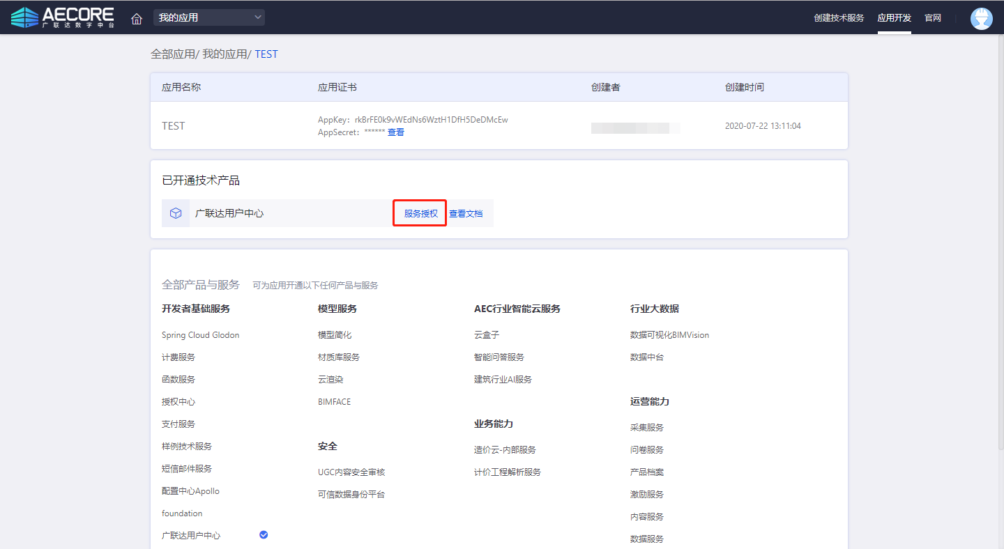 登录AECORE,并创建应用,创建应用后即可获取appkey、appsecret,这是调用服务的秘钥请妥善管理。