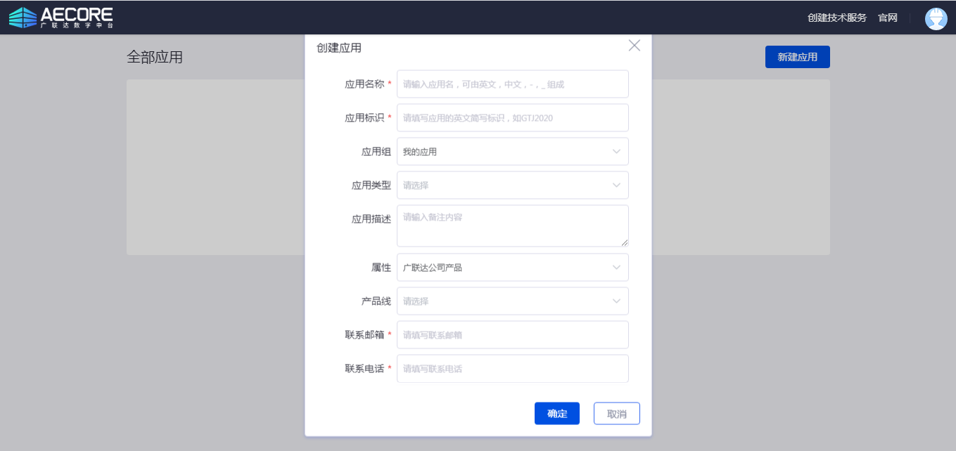 登录AECORE,并创建应用,创建应用后即可获取appkey、appsecret,这是调用服务的秘钥请妥善管理。